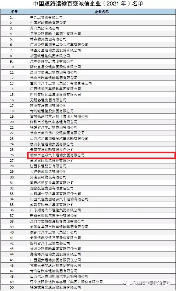 近日,由中國(guó)道路運(yùn)輸協(xié)會(huì)主辦的中國(guó)道路運(yùn)輸百?gòu)?qiáng)誠(chéng)信企業(yè)創(chuàng)建活動(dòng)經(jīng)過(guò)前期宣傳動(dòng)員、策劃組織、接受申報(bào)、統(tǒng)計(jì)計(jì)算、材料復(fù)核及審核評(píng)估等工作,現(xiàn)已圓滿落幕,并對(duì)“中國(guó)道路運(yùn)輸百?gòu)?qiáng)誠(chéng)信企業(yè)(2021年)”名單予以對(duì)外公告,榆林市恒泰汽車運(yùn)輸集團(tuán)有限公司榮獲百?gòu)?qiáng)誠(chéng)信企業(yè)稱號(hào)。中道協(xié)在該公告中指出:“中國(guó)道路運(yùn)輸百?gòu)?qiáng)誠(chéng)信企業(yè)創(chuàng)建活動(dòng)是本會(huì)為會(huì)員企業(yè)服務(wù)、為全行業(yè)服務(wù)的一項(xiàng)重要的公益活動(dòng)。活動(dòng)開(kāi)展17年來(lái),在各級(jí)交通運(yùn)輸主管部門(mén)、道路運(yùn)輸管理機(jī)構(gòu)和地方道路運(yùn)輸協(xié)會(huì)的支持下,本會(huì)借鑒國(guó)際通行方法,結(jié)合行業(yè)實(shí)際,每年度對(duì)全國(guó)范圍內(nèi)道路運(yùn)輸企業(yè)規(guī)模實(shí)力、競(jìng)爭(zhēng)能力、影響力及誠(chéng)信經(jīng)營(yíng)活動(dòng)進(jìn)行科學(xué)評(píng)價(jià),引導(dǎo)道路運(yùn)輸企業(yè)創(chuàng)新發(fā)展、誠(chéng)信經(jīng)營(yíng),對(duì)推進(jìn)道路運(yùn)輸行業(yè)調(diào)結(jié)構(gòu)、轉(zhuǎn)方式,實(shí)現(xiàn)可持續(xù)發(fā)展發(fā)揮了積極作用。百?gòu)?qiáng)誠(chéng)信企業(yè)創(chuàng)建活動(dòng)在行業(yè)內(nèi)外影響力和社會(huì)關(guān)注度持續(xù)提高,上榜企業(yè)知名度和公信力不斷增強(qiáng),充分展示了我國(guó)優(yōu)秀道路運(yùn)輸企業(yè)的群英形象”。