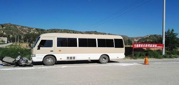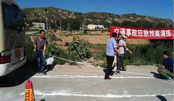 本次演練模擬情景在神木縣城關鎮(zhèn)石窖院村,一輛摩托車在駛出岔路口時,與城市道路上一輛疾馳而過的客運車相撞,導致摩托車司機受輕傷、客車輕微受損及摩托車嚴重受損的交通事故的發(fā)生。事故發(fā)生后,集團公司職能部門、汽車站和客運公司及時啟動車輛交通事故應急預案,出動了綜合協(xié)調(diào)、疏散警戒、后勤保障和安撫善后4個救援組,按照演練方案確定的處置程序和措施,對突發(fā)交通事故中的報案、傷員搶救、事故現(xiàn)場處理、事故調(diào)查等多個環(huán)節(jié)進行了演練,重點檢驗了駕駛員在事故發(fā)生時的應急處置、報警方式、職能部門及基層單位的接警處置方式、協(xié)調(diào)配合能力、啟動應急措施的反應能力和事故現(xiàn)場正確處置的應急能力。