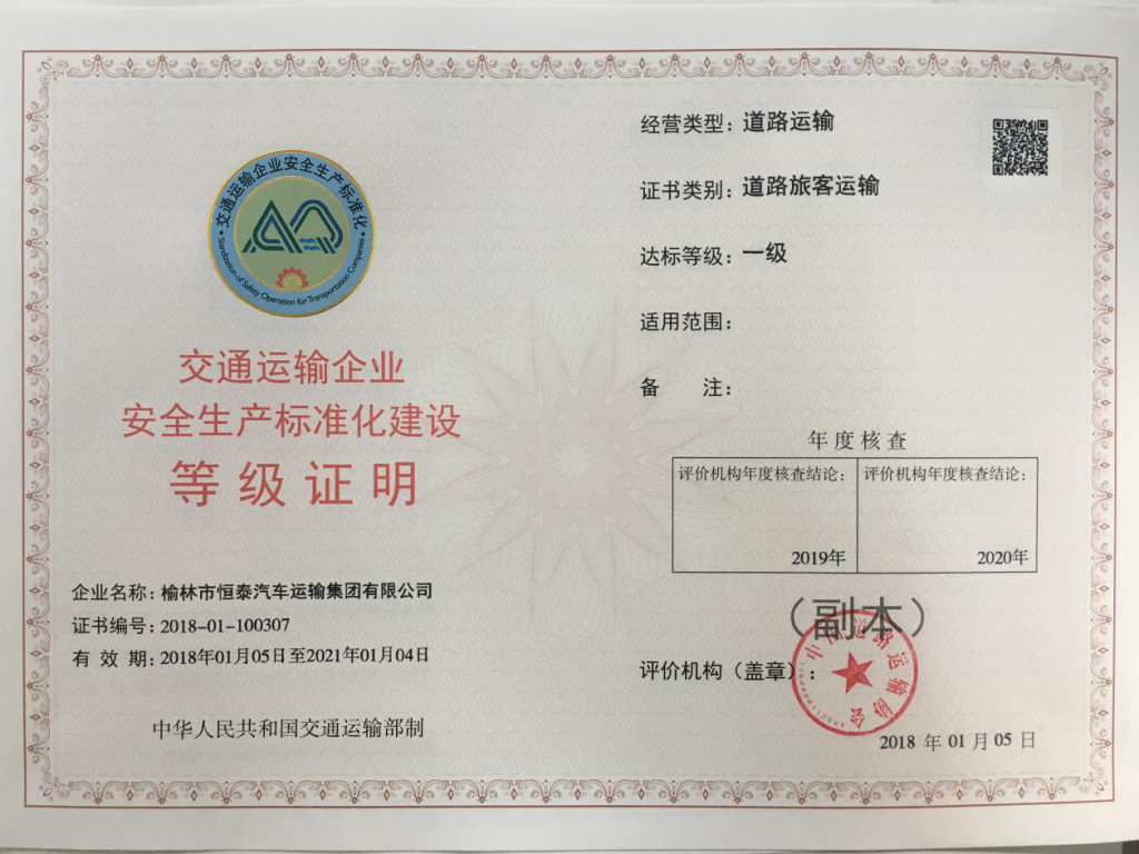 近日,集團公司收到中國道路運輸協(xié)會評價中心頒發(fā)的榆林恒泰集團40個安全生產(chǎn)標準化一級達標換證復評證書,集團公司持續(xù)一年的安全生產(chǎn)標準化換證復評工作圓滿完成。